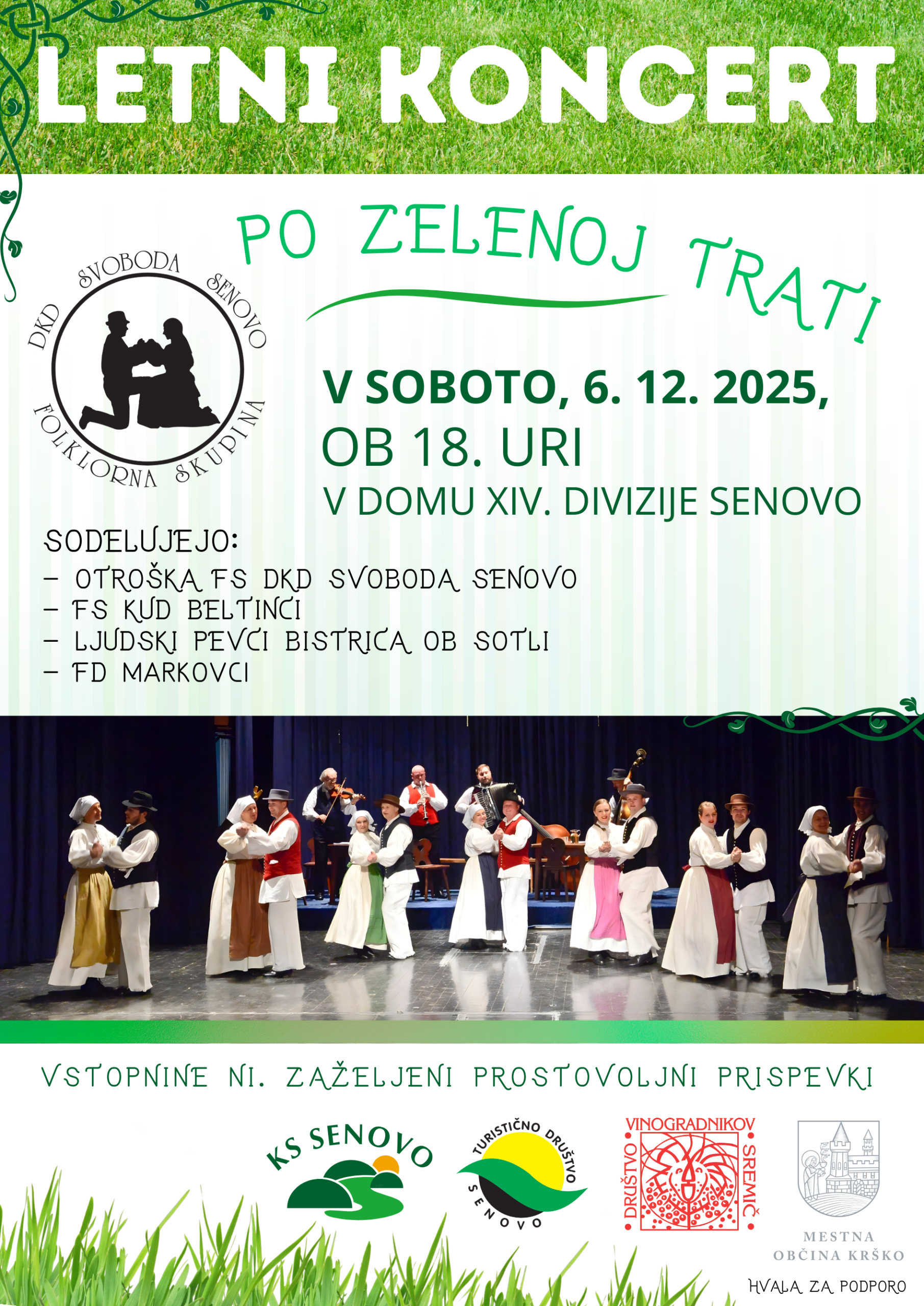 Folklorna skupina DKD Svoboda Senovo vabi na letni koncert v soboto 06. 12. 2025 ob 18 h, ki bo v Domu XIV. divizije Senovo.